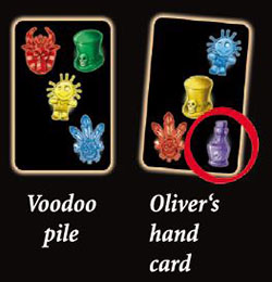First Oliver, and then Nick, has to pull out the bottom card from the Voodoo pile and then slide it under their own pile of ingredient cards.
