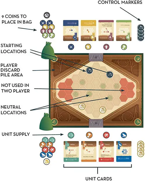 Place the board in the middle of the play area. For a two-player game, each player chooses a faction and takes 1 matching bag, 1 Royal Coin, and 6 Control Markers.