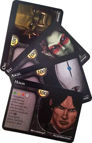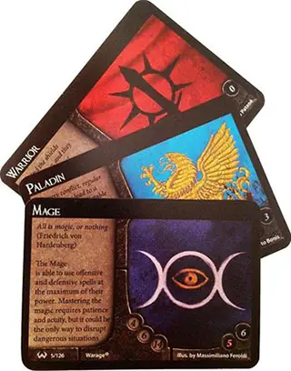 Warage is based on the clash of two or more heroes: a hero is created by choosing 1 race and 1 class card and can be equipped with weapons, armors, helms, spells and other items and abilites using the cards available in your hero deck.