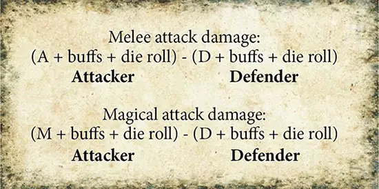 A Mage (M=14) equipped with a Bone Collar (+4M buff) who has active both a Fireball spell (+5M magic attack) and a Lightning spell (+7M magic attack) may choose to make two magic attacks.