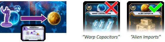 The Purple player moves their research drone to a Desert planet and obtains the available "Alien Imports" card as its Planet type matches the destination planet. They may not obtain "Warp Capacitors" even though their research drone is on an Oceanic planet, as a Research drone must be move to obtain a Technology.