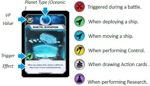 Technologies remain in play for the duration of the game, once unlocked. Some Technologies have a trigger icon, that serve as a quick reminder on when this Technology comes into effect: