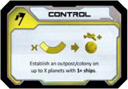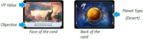 Objective cards represent ambitions and intrigues of various galactic Factions. Completed Objectives are worth 5VP at the end of the game. Keep your Objectives secret from other players.