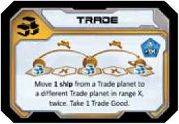 When resolving this action, you must move 1 ship from a planet with a trade icon to another planet with a trade icon in up to X range, and then, immediately, to a third planet with a trade icon in up to X range from the second planet. If you do not have a ship which is able to perform both movements, you may not resolve the Trade action.