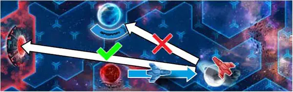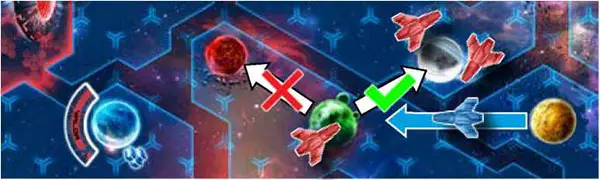 Example 1: The Blue player is attacking the Red player's ship on a Jungle planet. If the Blue player wins the battle, the Red player will have to withdraw. The nearest valid planet is the Arctic planet. While the Volcanic planet is within the same range, it has neither red ships, nor a red Colony, nor a red Outpost.