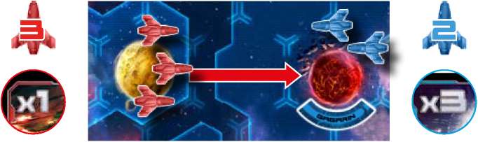 The Red player loses 2 ships and the Blue player loses 1. Then Heroic sacrifice is resolved and the Blue player loses his last remaining ship. Destroyed ships are returned to the corresponding player's supply. The Red player occupies the Volcanic planet.