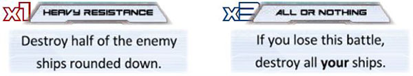 The Red player is attacking the Blue player with 3 ships and plays "Heavy resistance", The Blue player plays "All or Nothing". The Blue player wins with 6 total strength to the Red player's 3.