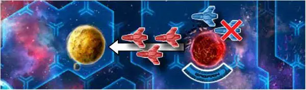 Example 2: The Blue player is attacking the Red player's ship on a Desert planet. If the Blue playerwins the battle, the Red player will have to withdraw. There are two valid planets for the Red player to withdraw. Since there is a choice, the winning player (Blue) gets to decide where the losing player (Red) must withdraw.