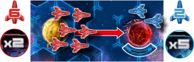 The Red player is attacking the Blue player with 6 ships. The Blue player only has 2 ships. After applying the multipliers, the Red player wins, 12 to 10.
