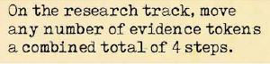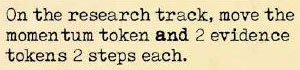 Finally, each player gains any evidence tokens that are on their side of the research track. The player with the initiative begins and pins all evidence tokens from their side (if any) to the evidence board (see the green box below). Then the other player does the same for any evidence tokens from their side.