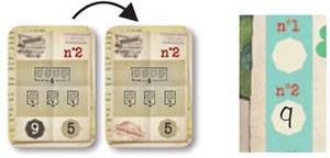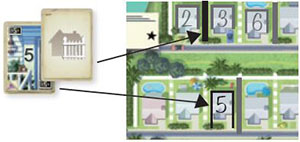 Example: After crossing off the top-most space in the 2-House estate column, each 2-house estate now scores 3 points at game end. The 3- and 4-house estates score points equal to their initial amount.