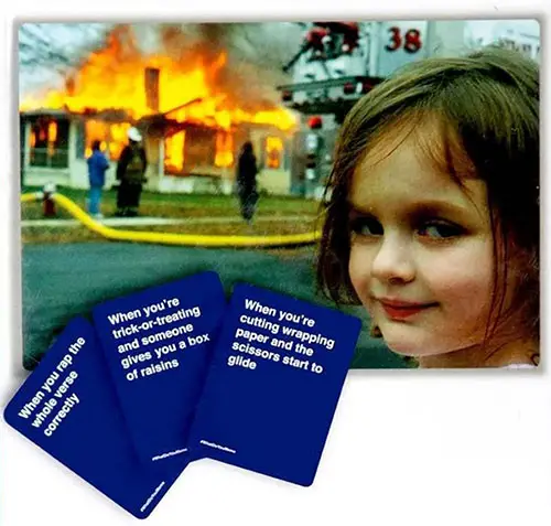 After hearing the scenario, you must then pick one of your 7 meme cards from your hand as a reaction to the scenario, and place the card face down onto the table.