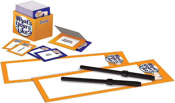 Decide if you will be playing with both sides of the Word Cards or just the orange side. Guess Words on the orange side could relate to almost anyone, while Guess Words on the purple side are things that kids might not have, like a mother-in-law. So if kids are playing, use only the orange side. If the players are all adults, use both the orange and purple sides.
