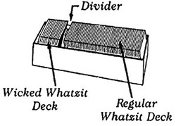 The Card Box: The code side of all cards must face the front of the box so the solution side can- not be seen when a card is drawn. There is a divider between the Regular Whatzit deck and the Wicked Whatzit deck.