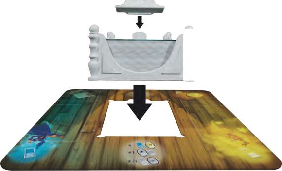Since the Dream Cards are double-sided, shuffle them thoroughly (by rotating and/ or flipping them) and place them on the Bed. Place the Headboard to cover one of the two Elements. Covered Elements are not used during the game.