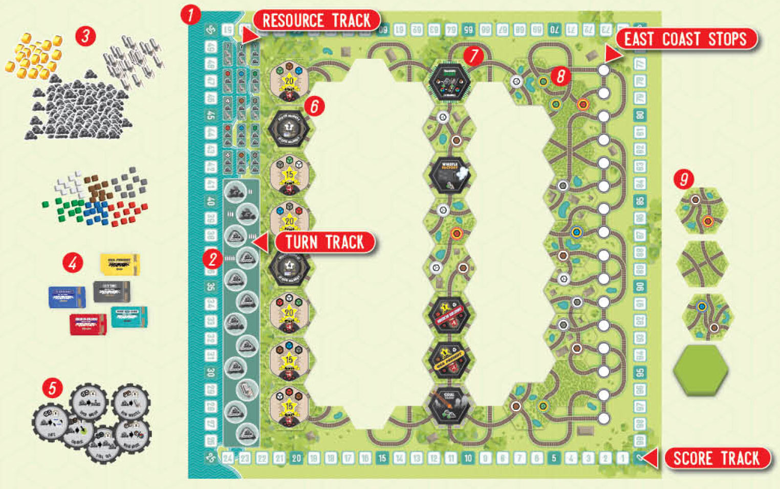 3 Put the gold tokens (shuffled with the numbers face down), coal tokens, whistle tokens, and resource tokens one side of the board.