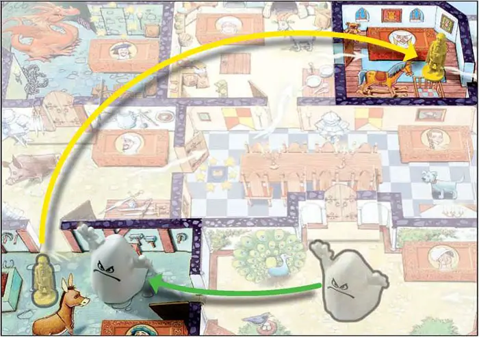 Example: The green player rolled the ghost: the ghost is moved forward by one room from the courtyard into the blacksmith's workshop.