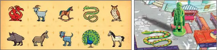 Example: The green player moved their playing piece to the chapel where the snake is located and pressed the room button with the snake on it.