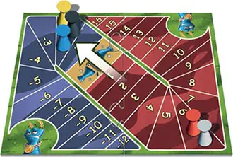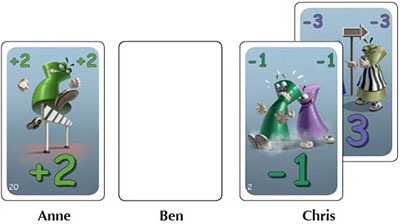 Example: 1 card with a +2 value is in front of Anne. She moves her figure 2 spaces forwards. There is no card in front of Ben, so his figure doesn't move.