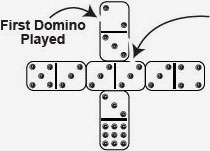 A double domino is a domino that has identical ends. When a double is played, it is placed criss-crossed to the open domino, to form a "T" shape.