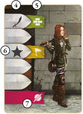 Action cards have a column of scales 4 and a column of flags 5. If a character 's icon appears in a scale 6, then that card can be used to move that character.