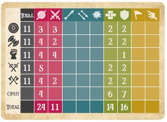 These provide a breakdown of which characters can take which actions, and how frequently they occur in that faction's action card deck.
