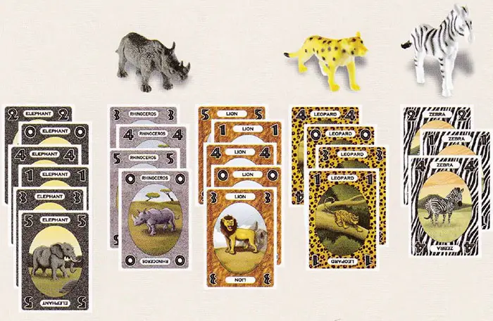 With five players, use all 30 cards. Deal the cards evenly to all the players, who take the cards into their hands. Divide the animals into five separate groups (by species), reachable by all players.