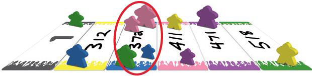 Pink gets 2 points for the large Meeple and 1 point for the small Meeple.