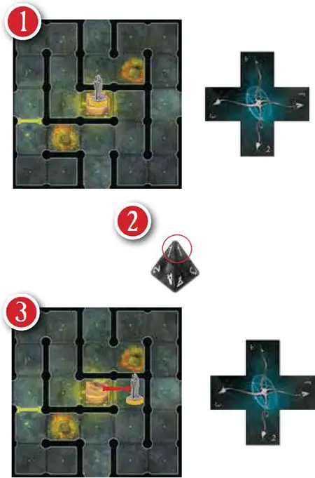1 The yellow wizard wants to move out of a dust cloud, but the dust cloud forces the wizard to move in a random direction. To do so, the player places the random movement overlay and rolls the die.