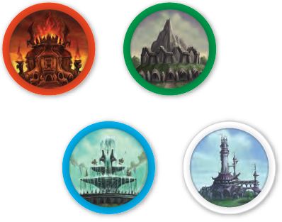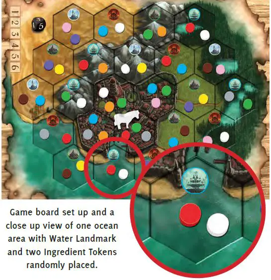 Shuffle the landmark tokens face down. Randomly place one landmark token face-up on each forest, mountain, ocean, desert, and plains area of the board. Place no landmark tokens in the cities. (Landmark tokens create a different set-up for each game).