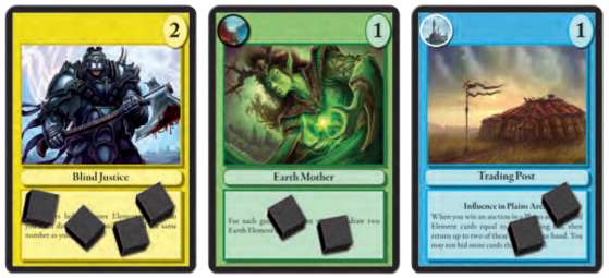 Once all players but one have passed, the final bidder discards a number of element cards equal to the winning bid, discarding any type or types of element cards if bidding in a city or the single acceptable type of element card if bidding in a landmark area.