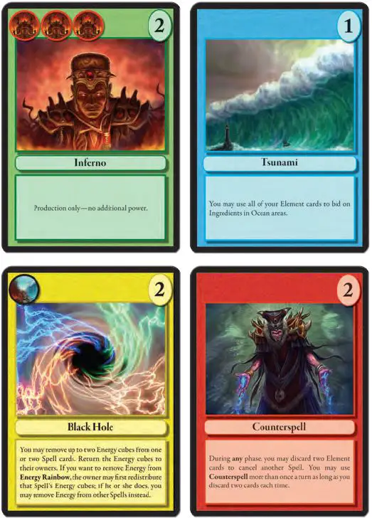 Most Spells produce elemental energy, which players will use during the next phase to try to acquire Ingredients. Starting with the player holding the Wizard marker and proceeding clockwise around the table, each player collects the Elements produced by his or her Spells.