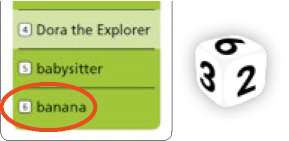 Example: Blue has rolled a 6. In this round, you must get your team to guess the word next to the 6, which is "banana".