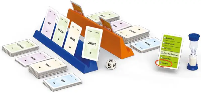 The blue team's storyteller takes control of the hourglass and the die first. He or she rolls the die. Then, the orange team's storyteller picks up the answer card from the top of the draw pile.