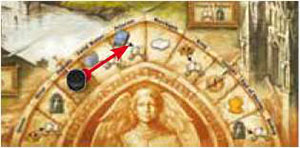 Example: The direction arrow points to the 2. Move the favor marker forward 2 spaces.