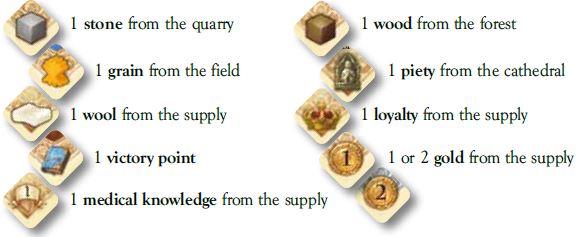The income available to you is indicated on the building spaces. Some resources, such as piety and grain, may be scarce. If they aren't available, then you don't receive them as income.