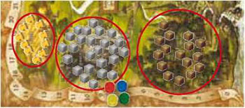 Add one matching resource to each building project on the game board to symbolize construction progress. If a building project has both a stone and a wood space free, fill the stone space first.
