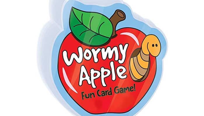 "Nobody likes worms in their apples! Rid your apple of the pesky worms first and you win! Do whatever it takes -- pull worms out, give a worm to an opponent or even trade for an apple with fewer worms. Lunch box tin contains 4 plastic apples, 32 worms, spinner, and instructions."