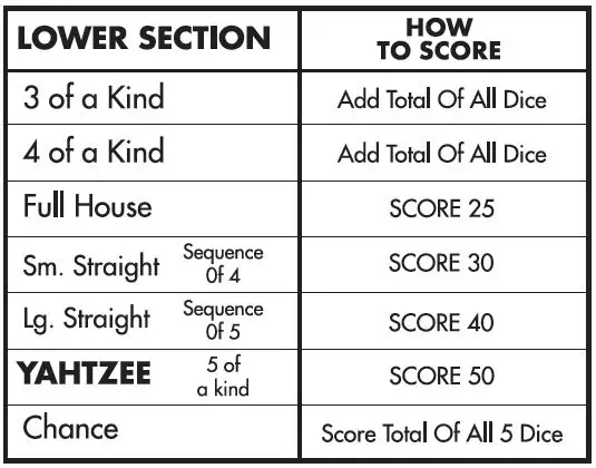 The score card is divided into an Upper Section and a Lower Section. Scoring combinations for each section are explained below.