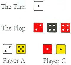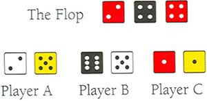 All players look at the Flop dice to see how they measure up with their pocket dice. Each player now has five available dice: their two pocket dice, and three community dice.