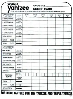 If your first Yahtzee word was scored as 50 points, you receive a bonus of 100 points for a second and subsequent Yahtzee word. Add the 100 bonus points to the Grand Total and put your score on the back of the score sheet. If you did not make your first Yahtzee word but placed a zero in the box, you are not entitled to any bonus points.
