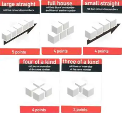Example: Your Small Straight beats an opponent's Small Straight because the total of your dice is higher