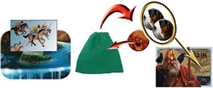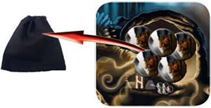Odin takes the green bag that corresponds to the island where the Valkyries are. He takes 3 counters: 2 Vikings and 1 Fire Giant. He keeps the 2 Vikings andputs back the Fire Giant in the green bag.