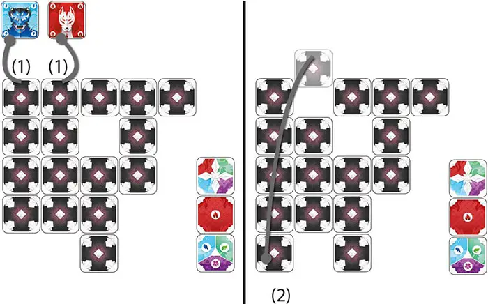 It's Nicolas's turn. First, he secretly takes a look at two Yokai (1). He discovers an Oni and a Kitsune and puts them back where he took them. Then he must move a Yokai, making sure not to split the group apart.