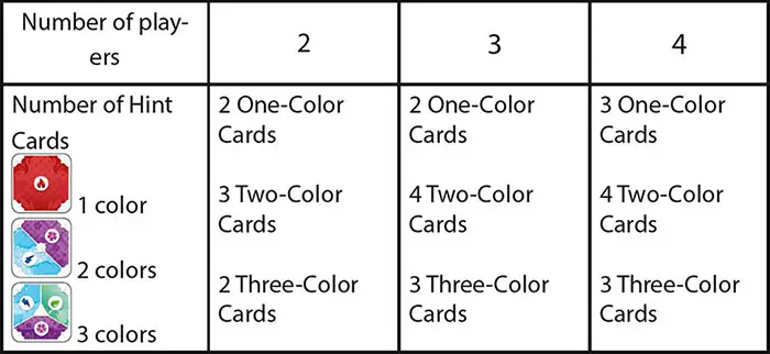 Randomly take as many Hint Cards as shown in the table below, according to your player count. Do not look at these cards.