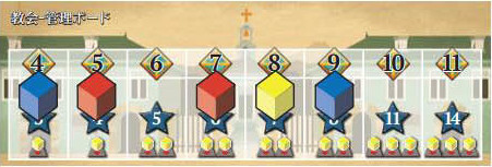 A number of Assistant pawns on the Church Manage- ment Board has been placed (2 Players: 4; 3 Players: 5; 4 Players: 6)