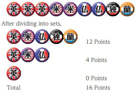 At this point, return all unfulfilled Order cards to the box. Each player now looks at the number of different Country icons they have in their possession from their Technology cards and completed Order cards and divides them into sets. 1 icon may only be used once per set. The following table shows how many bonus points a player receives:
