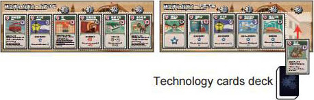 11. Shuffle all the Technology cards face down and place them in a deck in the playing area. From this deck, draw and place Technology cards face up in each space of Laboratory A (and B) Technology Card Placement Area until all spaces on both Laboratories A (and B) Technology Card Placement Area are filled.