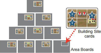 4. Shuffle all the Building Site cards face-down and place 1 Building Site card face-up on each Area Board on the space stipulated. The remaining Building Site cards will not be used in the game and should be re- turned back to the box.