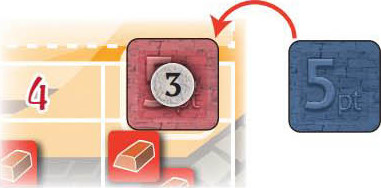 Example: Hisashi has 5 Copper tokens in his possession. There is an Achievement card that requires 5 Copper as a condition to complete the Goal card. Hisashi fulfills the Achievement card, and places an Assistant pawn from his hand to the Achievement card. Since Daryl and Seiji already have Assistant pawns located on the Achievement card, Hisashi scores the rightmost Victory Point total, which is 6 points.